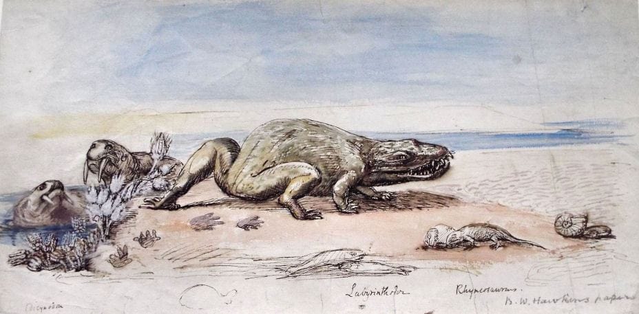 Hawkins could be most likely trying to represent an extinct animal, by reproducing the image of a known living animal, to which the public would be familiar. Thus, the Labyrinthodon of Owen became transformed to the more frog-like creature of Hawkins.